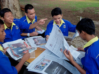 Instead of using the classroom for a lesson, the boys and girls of 5VE3 carried out a group activity in the area outside the school library. The students were given the task of looking for prominent personalities who had contributed to the success of the nation through their efforts. They were to look for articles and information they needed from newspapers. The group members would then make folios from the materials that they had gathered.